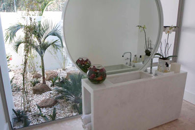 The result is a magnificent building consisting of three storeys with a huge cantilevering cap, almost like a top hat, over the entire structure. It is tall and elegant and indeed smacks of Paradise Found. It is this architectural element which unifies the structure holistically and gives it soul. Notable features include a wine cellar in the basement with frameless glass surround and a hotel spa consisting of steam room, sauna, Jacuzzi, Roman bath and massive wet wall running from inside to out with both hot and cold pools, a jacuzzi and a rain shower. There is also a misting area where one can sit on a hot day, clothed or unclothed, and cool down while taking in the spectacular landscaping of the outdoor spa and gym area which is extremely private.